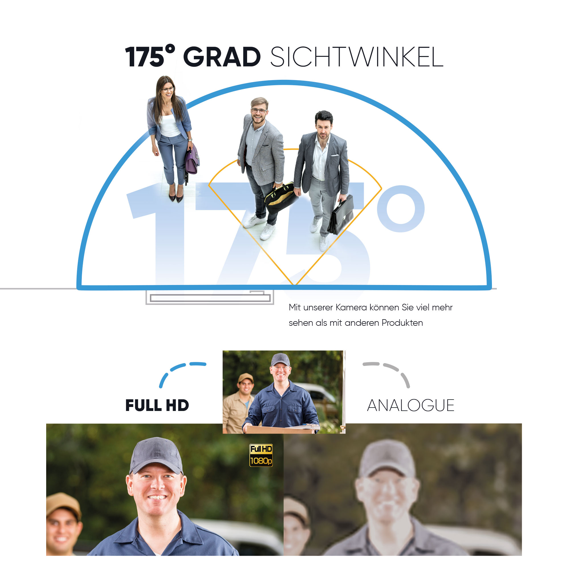 Ein Bild sagt mehr als 1000 Worte. Deshalb zeigt EVO Ihnen ein Livebild Ihrer Besucher und Sie wissen sofort, wer vor der Tür steht. Die in der Außenstation verbaute Weitwinkelkamera verfügt über einen Sichtwinkel von 175°. Damit deckt die Kamera fast die gesamte Horizontale ab, und Sie sehen Besucher die sowohl neben, als auch unter der Kamera stehen. Sogar wenn mehrere Besucher gleichzeitig vor der Tür stehen, können Sie sie identifizieren.