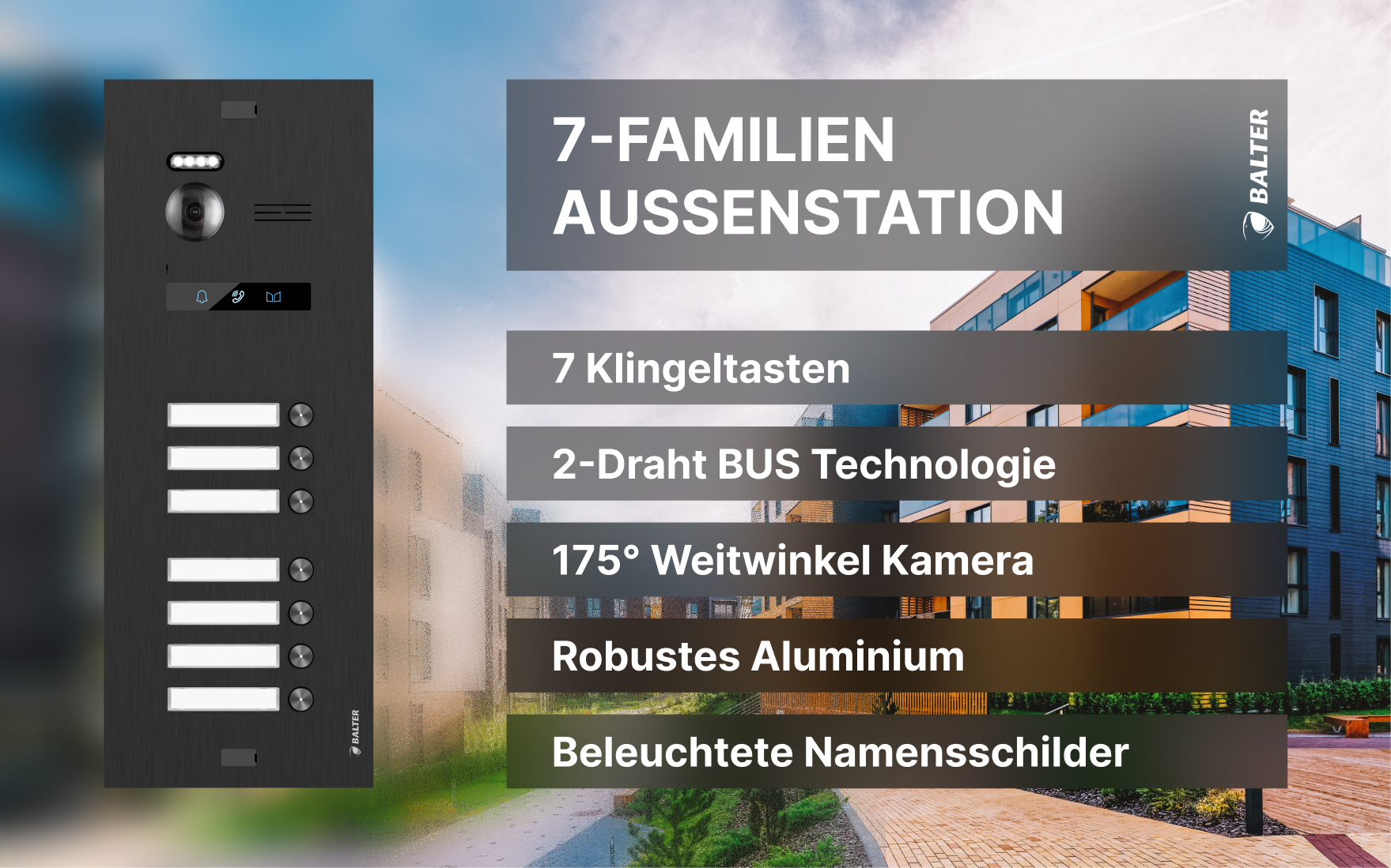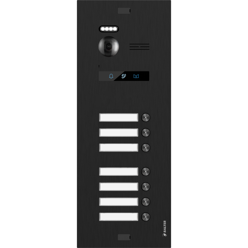 BALTER EVO-HD-BLACK-7FAM Schwarze Türstation für 7 Teilnehmer, IP über 2-Draht BUS Technologie (Video / Audio / Strom), 175° Ultraweitwinkel