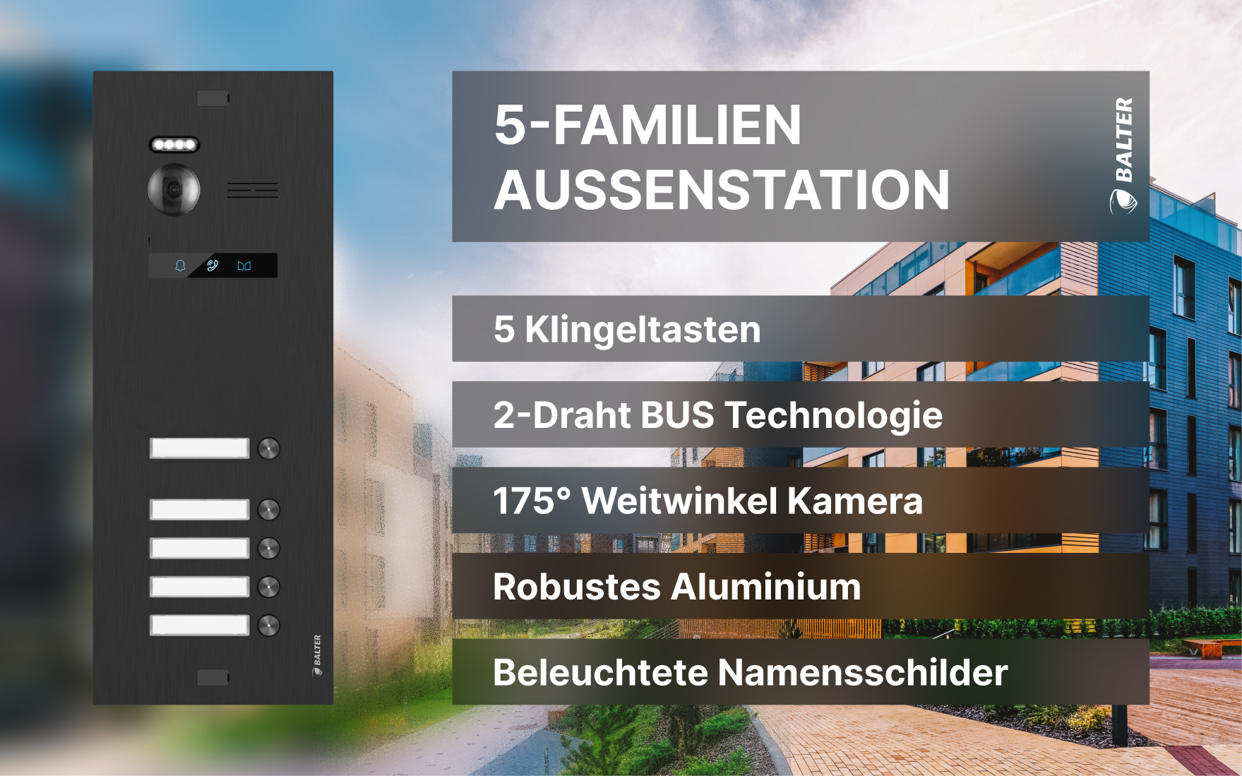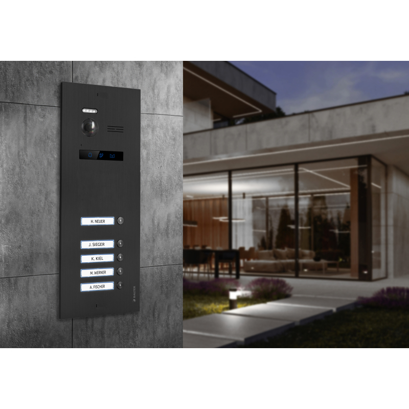 BALTER EVO-HD-BLACK-5FAM Schwarze Türstation für 5 Teilnehmer, IP über 2-Draht BUS Technologie (Video / Audio / Strom), 175° Ultraweitwinkel