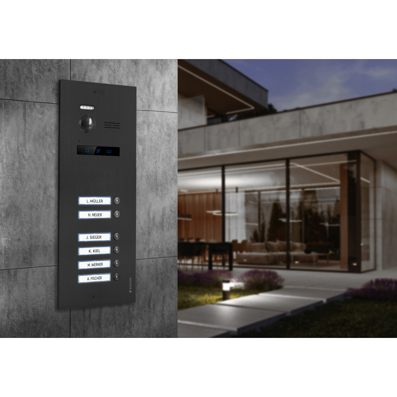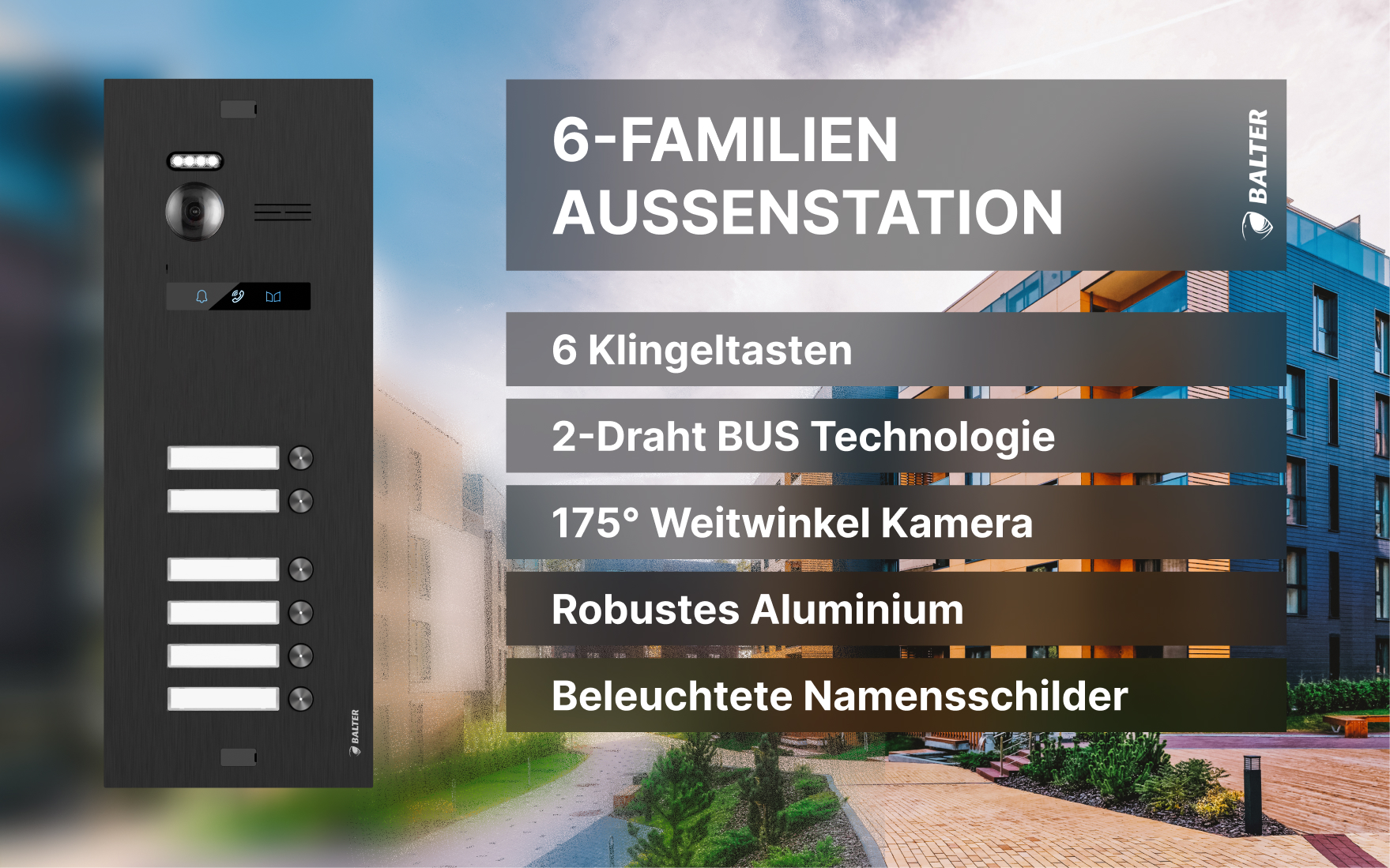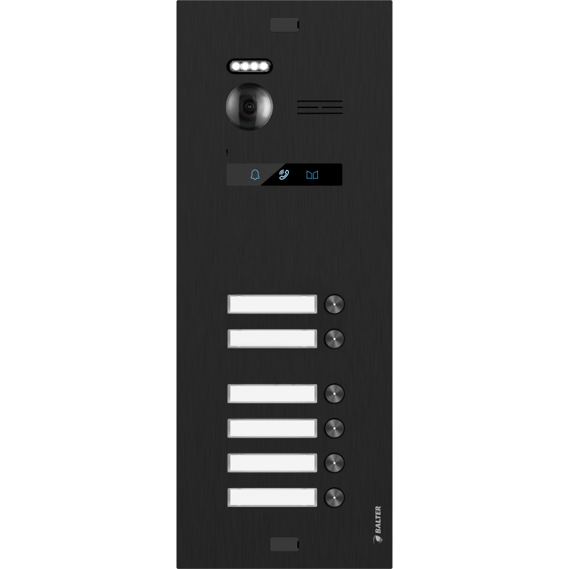 BALTER EVO-HD-BLACK-6FAM Schwarze Türstation für 6 Teilnehmer, IP über 2-Draht BUS Technologie (Video / Audio / Strom), 175° Ultraweitwinkel
