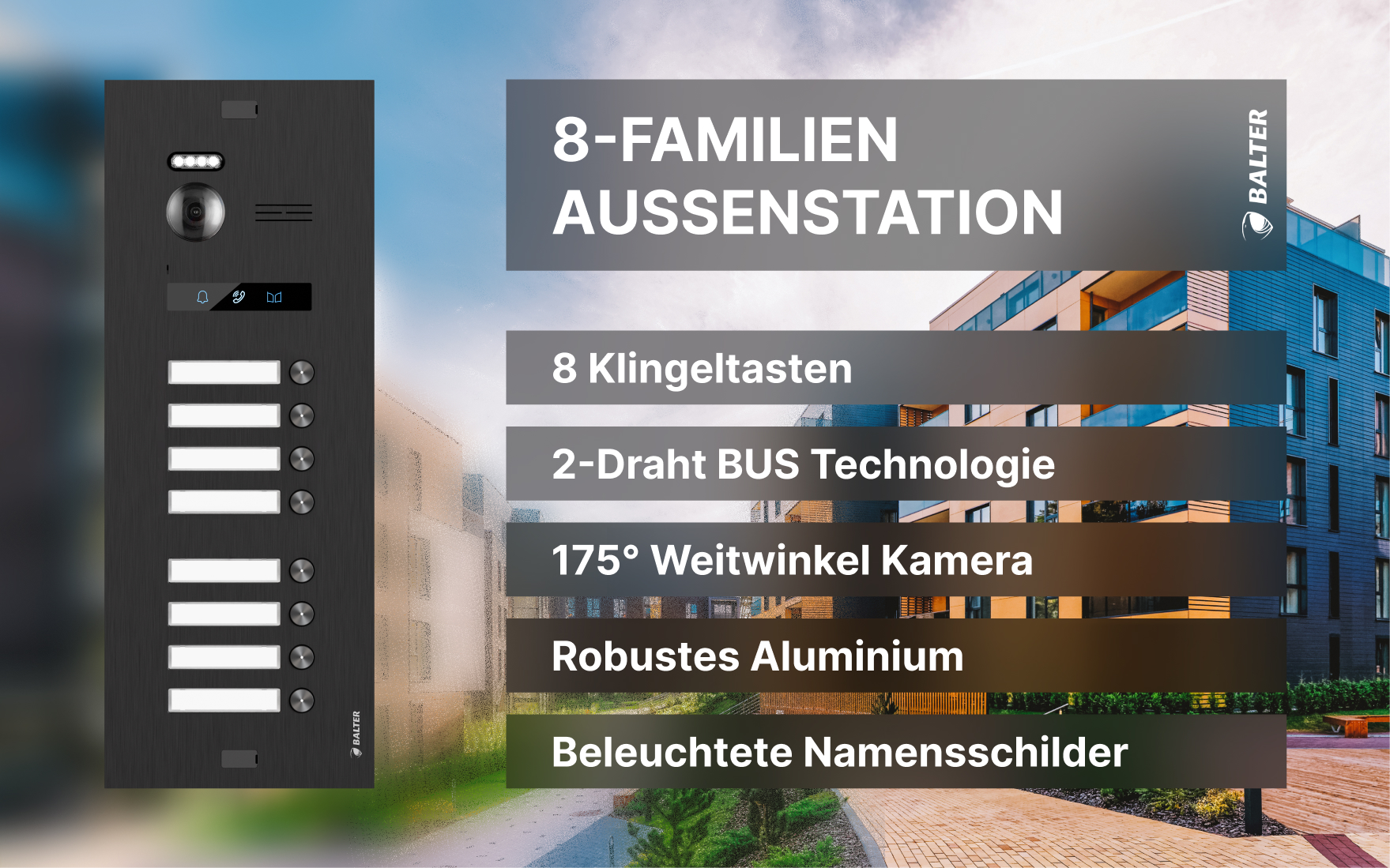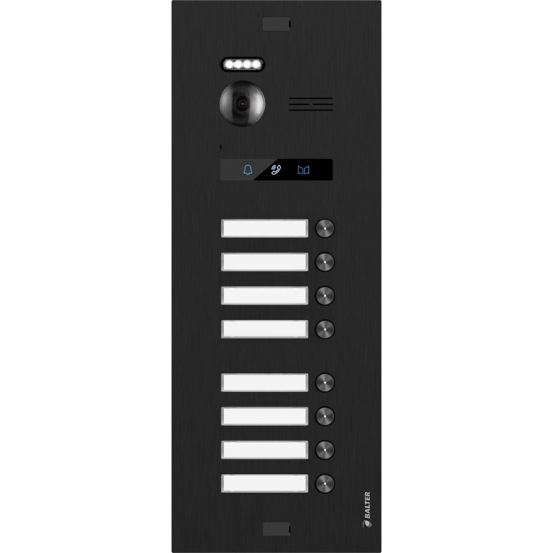 BALTER EVO-HD-BLACK-8FAM Schwarze Türstation für 8 Teilnehmer, IP über 2-Draht BUS Technologie (Video / Audio / Strom), 175° Ultraweitwinkel